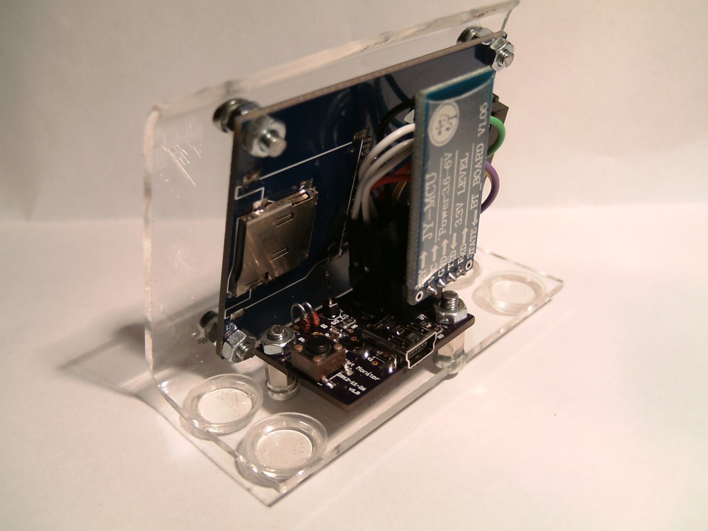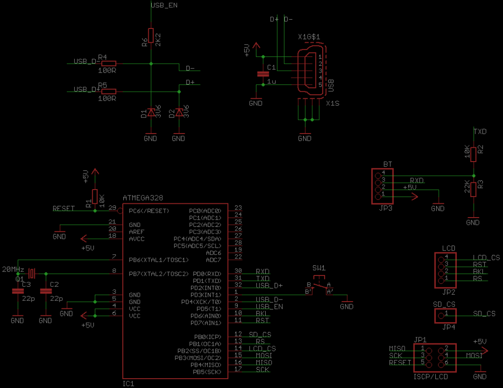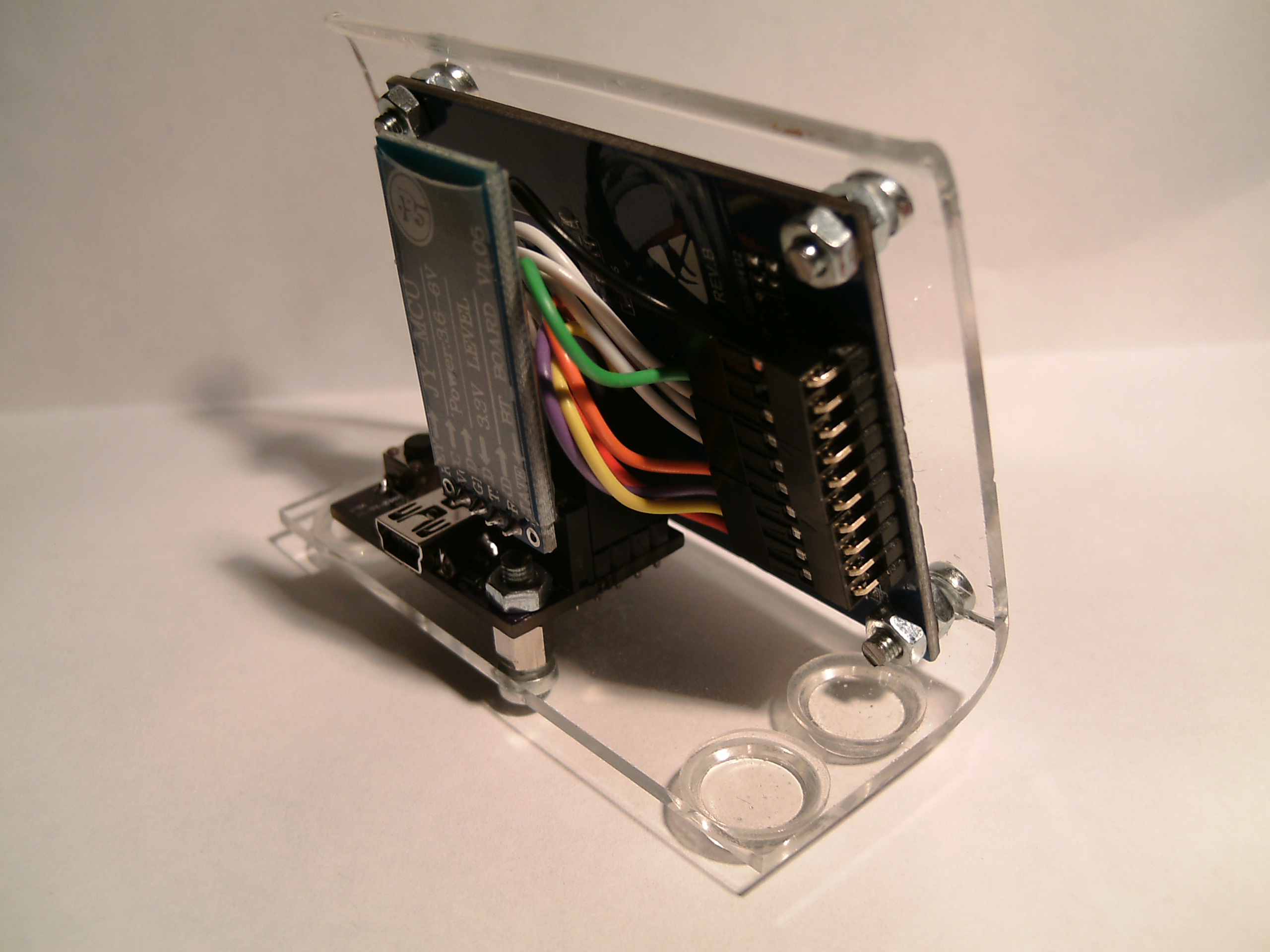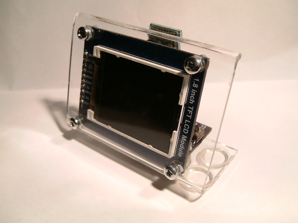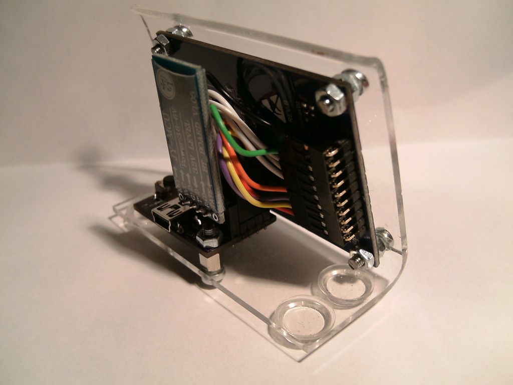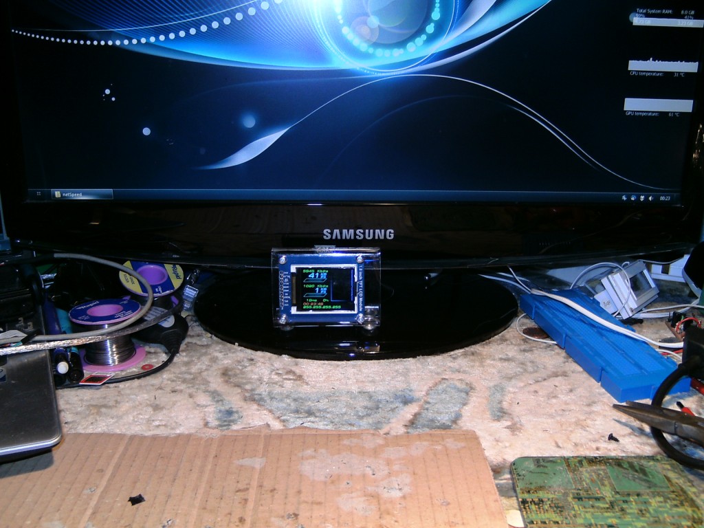 The monitor uses an ATmega328P @ 20MHz, 160×128 1.8″ colour LCD, a Bluetooth module, is powered by USB’s 5V, has a button for changing LCD brightness (long press) and display mode (short press) and since it’s powered by USB I added support for V-USB. The plastic part with everything screwed on to is an A8 paper display holder with the back clippy part removed and some rubber feet added.