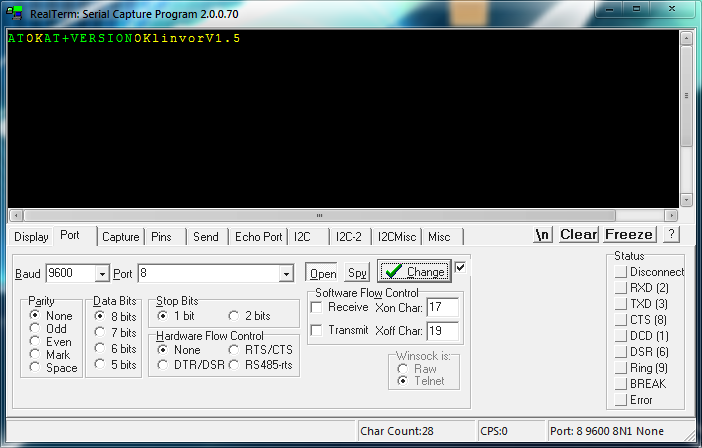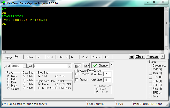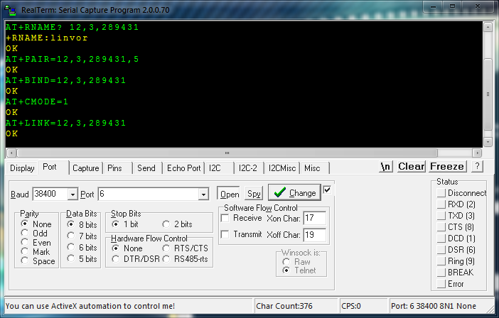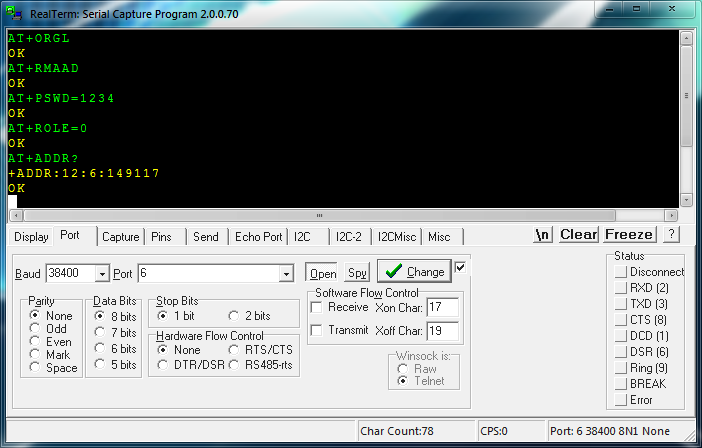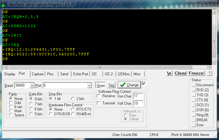 The slave module can be configured whenever no other BT devices are connected to it, the default baud rate is 9600, no parity, 8 data bits, 1 stop bit. Once you’ve opened the COM port in your serial console, type AT, the module should reply back with OK.