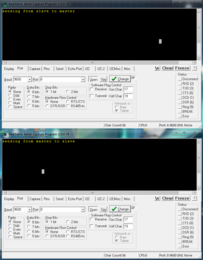 If you open up 2 serial consoles and have one open the COM port to the slave and the other open the COM port to the master you should be able to type in one and it will appear in the other console, if that worked you just need to plug them in to your projects!