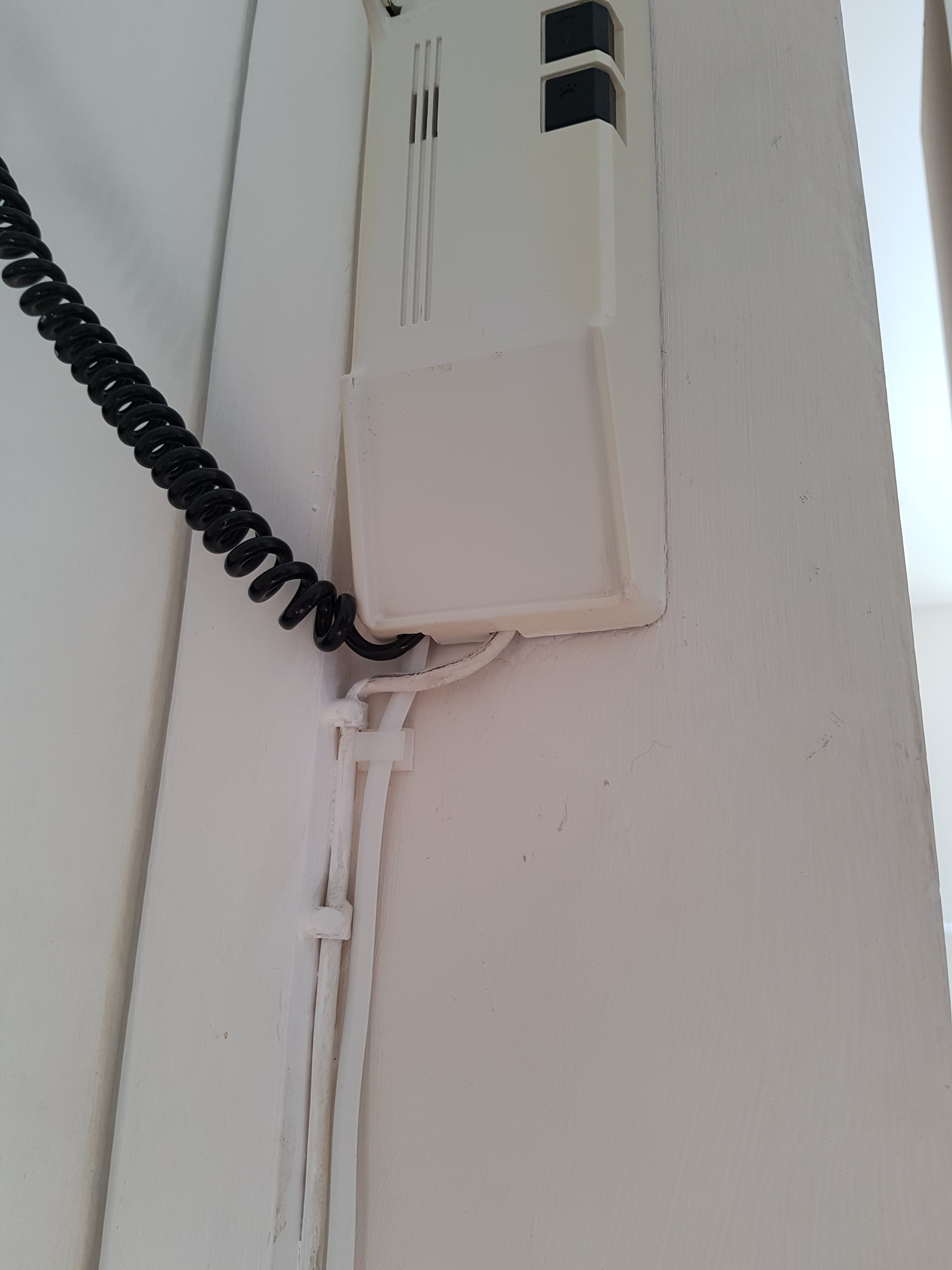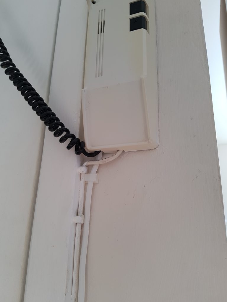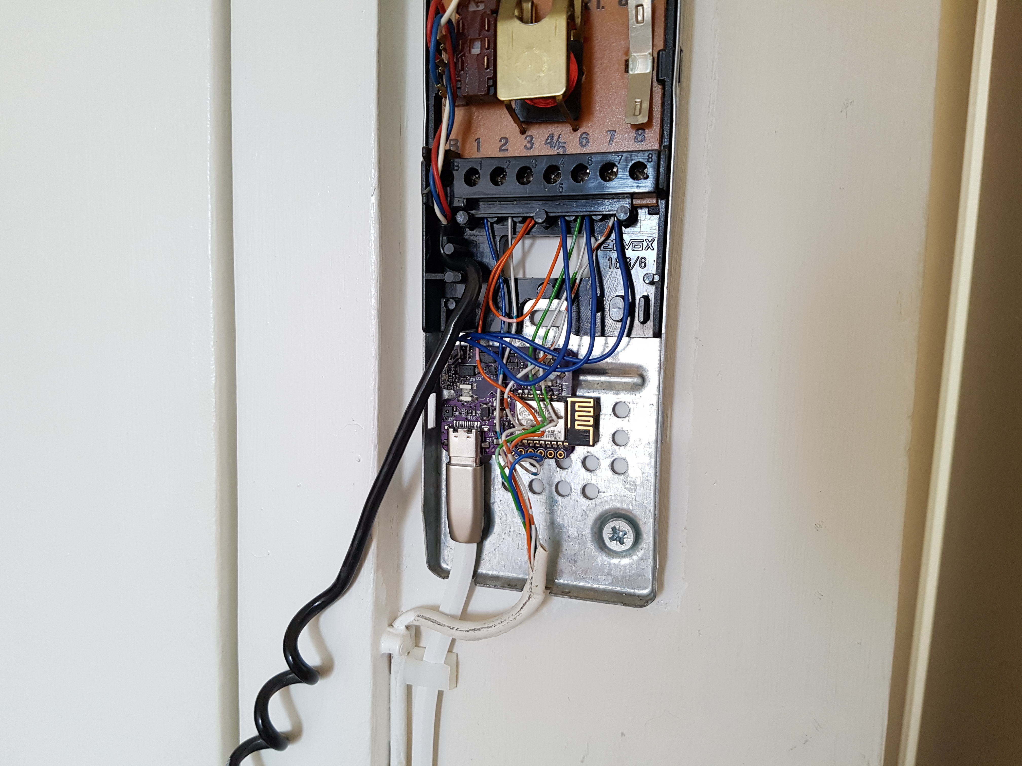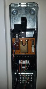 The apartment intercom system has the usual basic setup; it has a buzzer, a button for unlocking the lobby door and a handset to talk to whoever is wanting to come in, although the microphone doesn’t work in my intercom. It’s supplied with 14V AC and it’s also rather electrically noisy; there’s no inductive voltage spike suppression and small arcs are often seen when releasing the button that controls the solenoid for unlocking the lobby door, something I’ll need to be careful of when connecting a controller. It also causes the error counter on my broadband modem to go up by 1 every time it’s pressed!