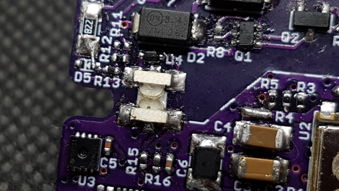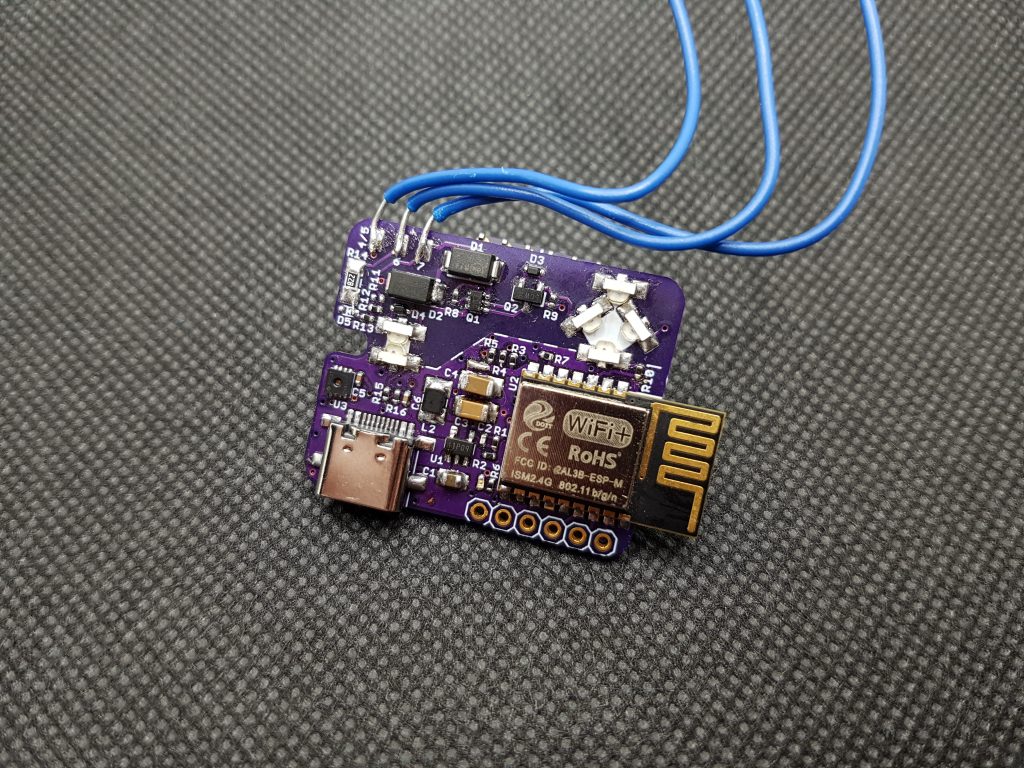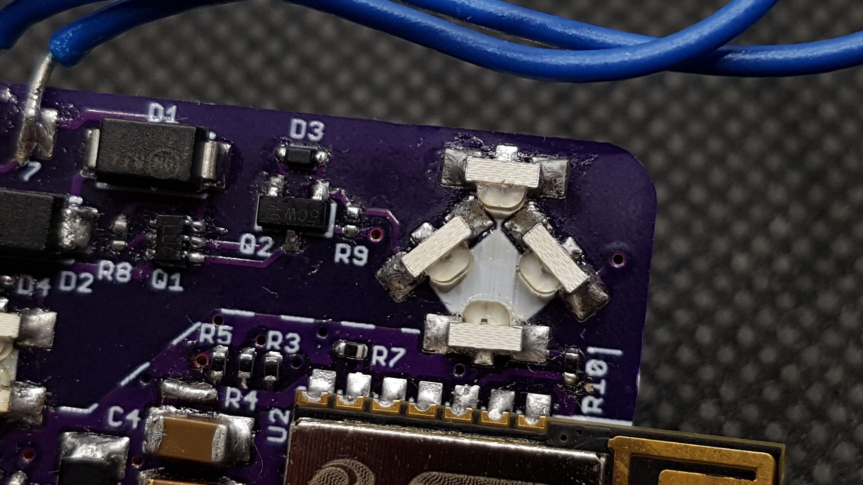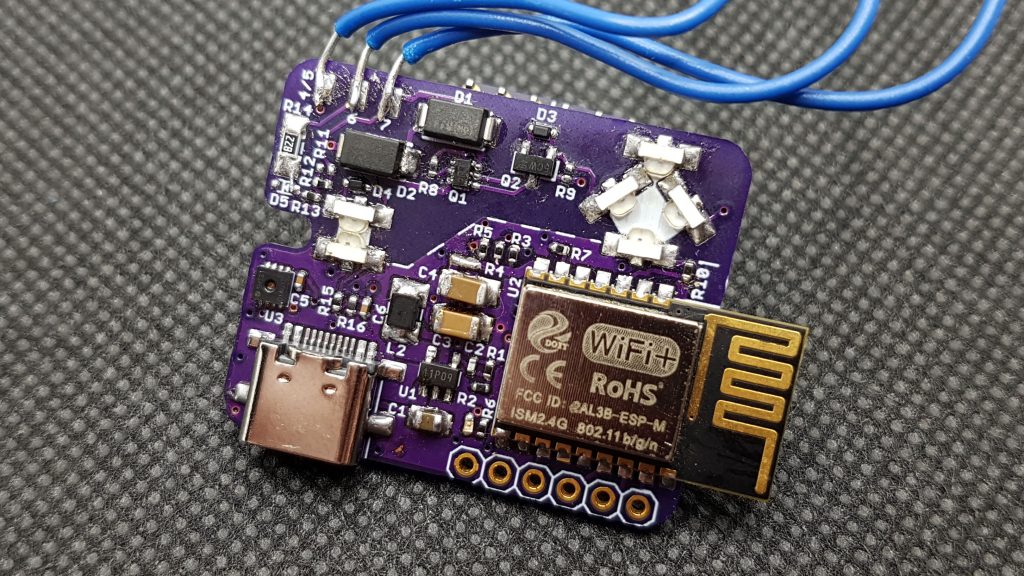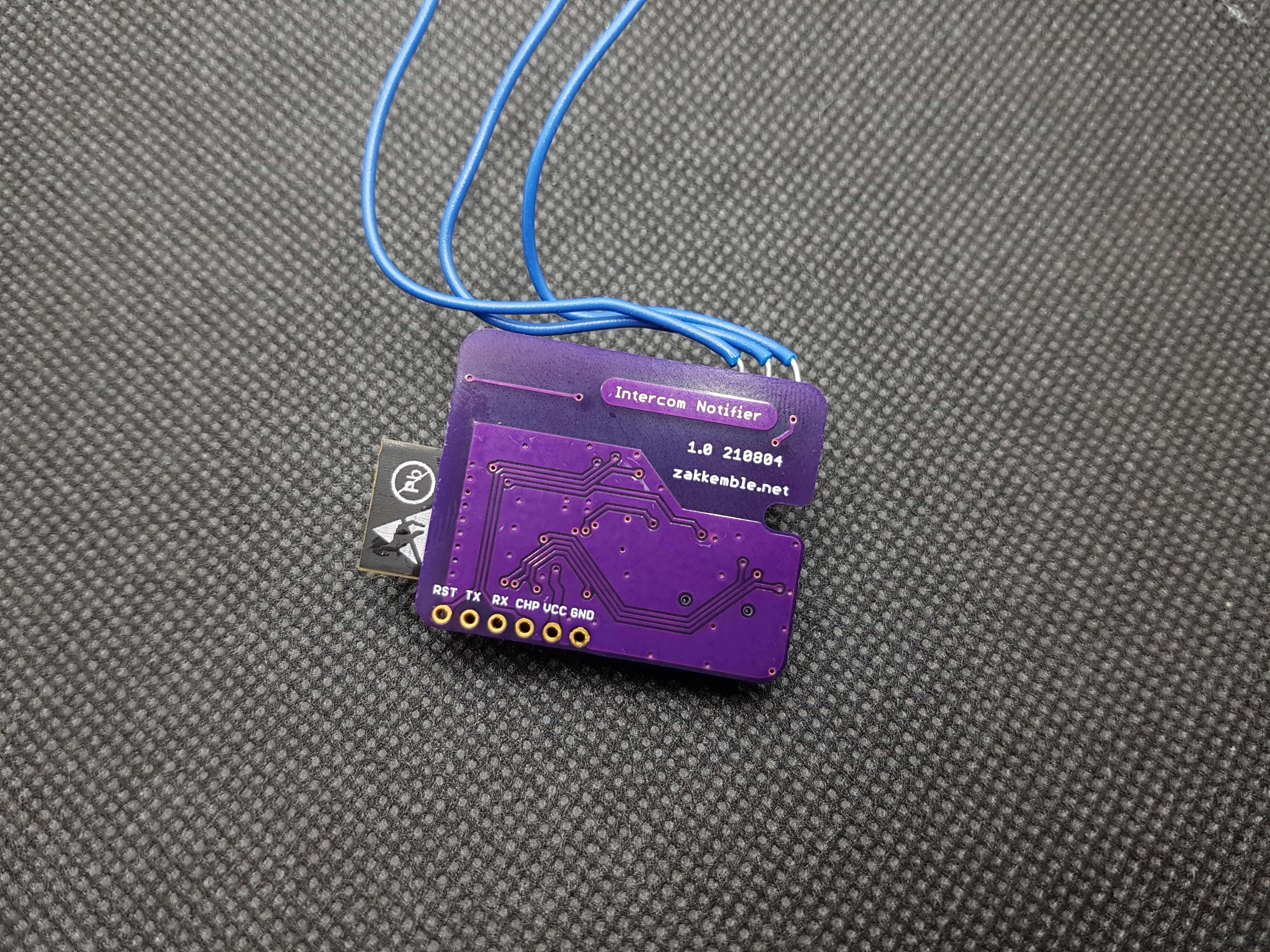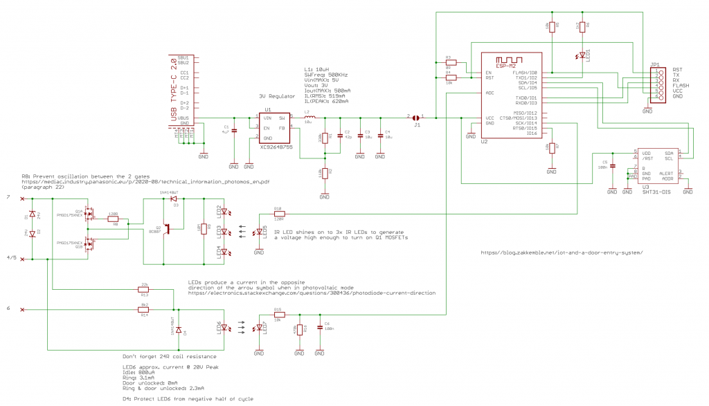 Detecting a buzz is done through 2 infrared LEDs (LED6, LED7; Kingbright KPA-3010F3C) creating an opto-coupler. LED6 is the emitter connected to the intercom ring wire and faces a sensing LED operating in photovoltaic mode – similar to a solar cell, it produces a current in the opposite direction to the arrow when light shines onto it. The sensing LED is connected to the ESP8285 ADC input through a low-pass filter. When the intercom buzzes the emitting LED shines onto the sensing LED which then produces a small voltage that the ESP can detect. The reason for the low-pass filter is that the intercom runs from a 50Hz AC power supply, so the sensing LED will also output a 50Hz waveform and the ESP would have the take an ADC sample roughly every 5ms to reliably detect something. However, the ESP didn’t seem to work too well when sampling the ADC this often as it is also used for various internal WiFi things, so instead the low-pass filter smooths out the waveform to allow sampling every 50ms.