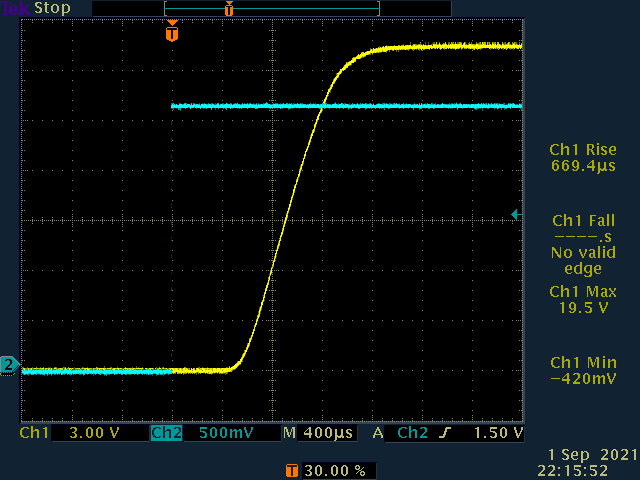 Yellow: Voltage across 32.5R test load (615mA @ 20V)
