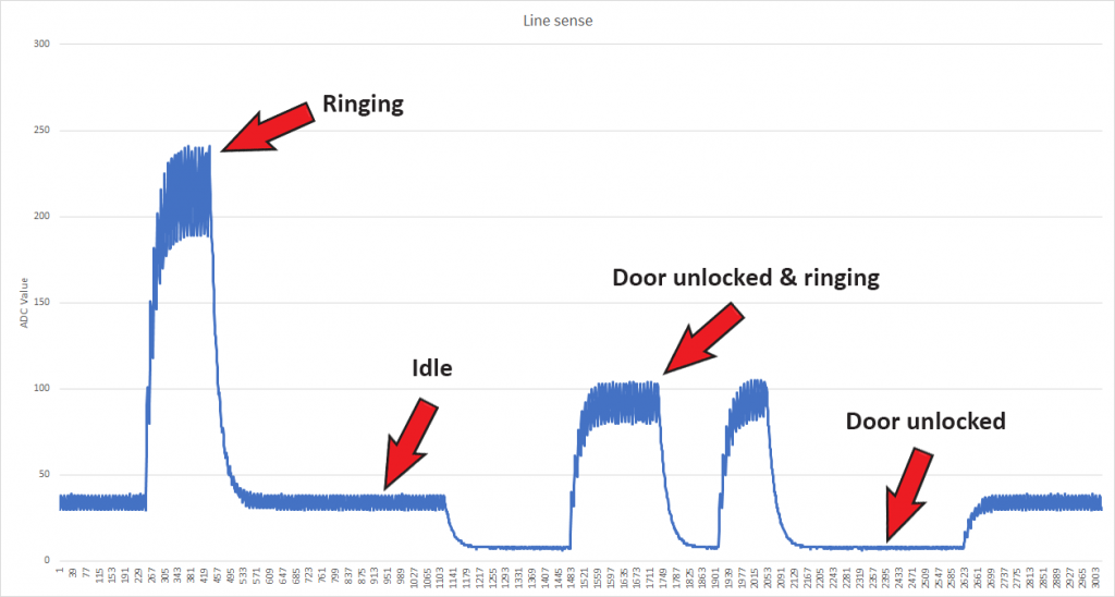 Since all of the intercoms in the building have their door switches wired in parallel it is possible to detect when someone else unlocks the lobby door from their intercom. With the right value resistors connecting the emitting LED to both the ring input and the door switch results with the LED shining at 4 distinct brightness levels, producing an equal number of distinct voltage levels at the ESP ADC input.