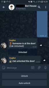 The door can be unlocked by the inline keyboard option or the by the /unlock command. The Node.js Telegram bot then picks this command up from the Telegram servers and relays a JSON message back to the controller, unlocking the door for 3 seconds: