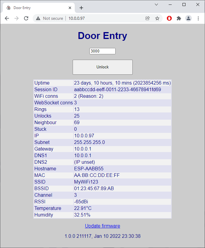 There’s also an auto-unlock feature that will automatically unlock the door if the buzzer is pressed within 5 minutes, very handy for when I’m carrying up a load of shopping and I don’t want to fumble around with keys. The ESP hosts a local web server allowing control of the door lock without all of the Node.js and Telegram stuff and new firmware can be easily uploaded.