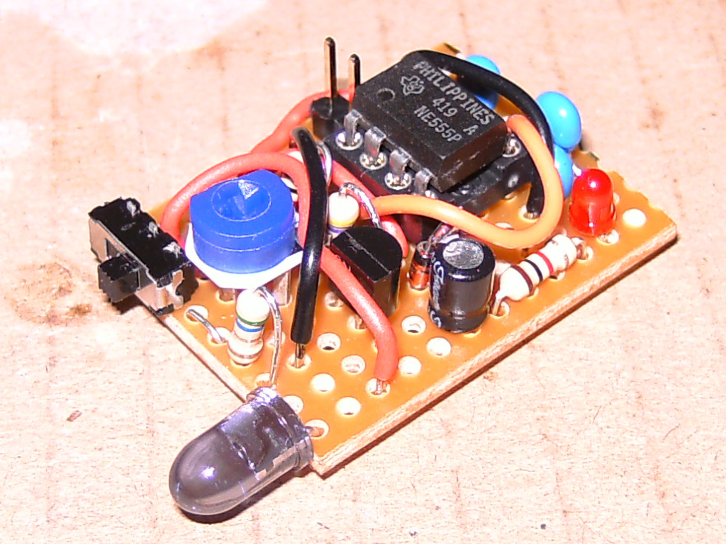 Some things to note, the transistor, 470R and 5R6 resistors and 1N4148 diodes form a constant current source for the IR LED of about 125mA, the transistor can get fairly warm. Using a supply voltage of 9V and LED Vf of 1.6V will result in a voltage drop of 6.8Vce across the transistor, at 125mA that comes to 850mW of heat (0.125A * 6.8Vce = 0.85W), which is actually above the rated 630mW for the 2N4401 which I used, so make sure to choose the right transistor.