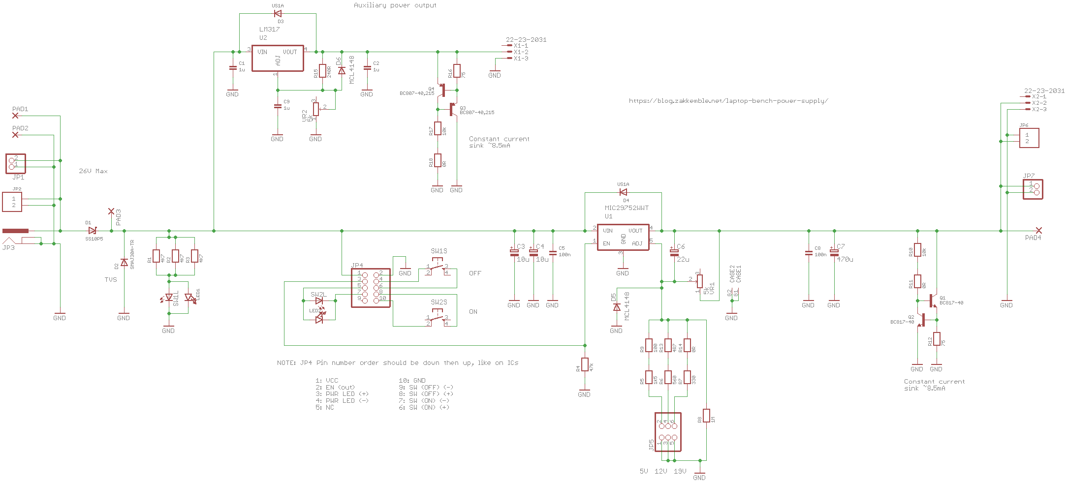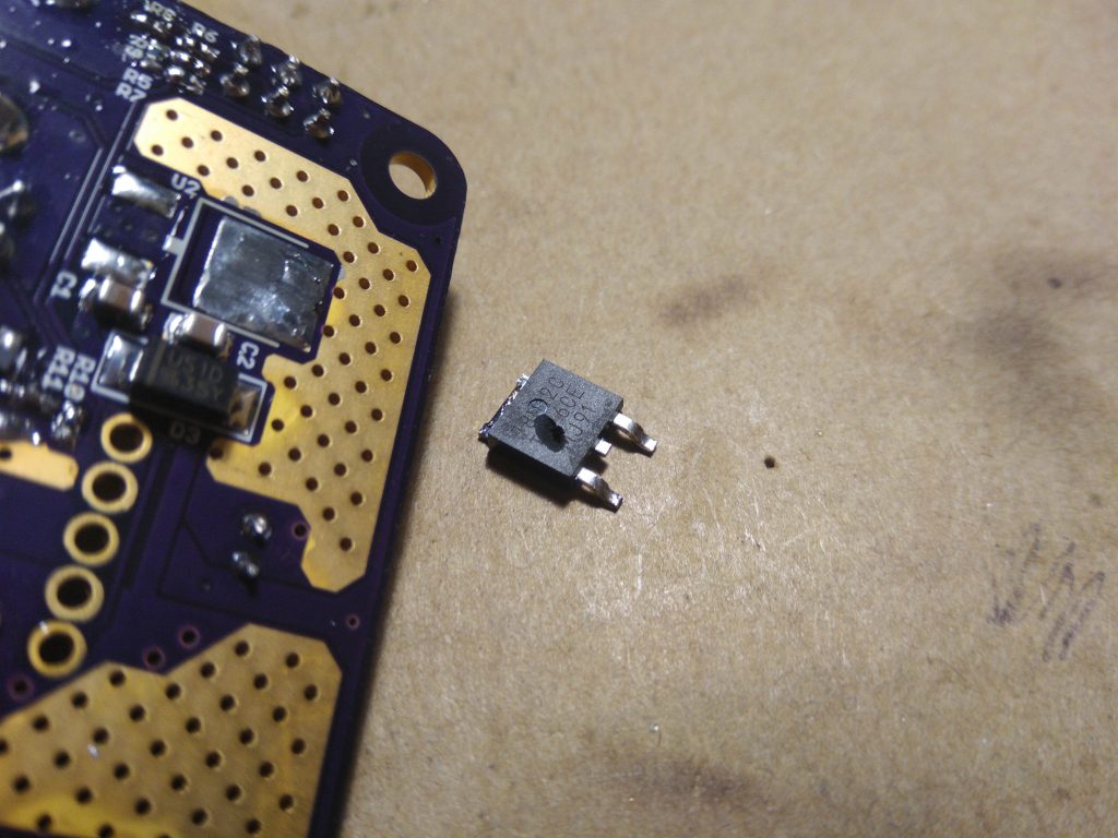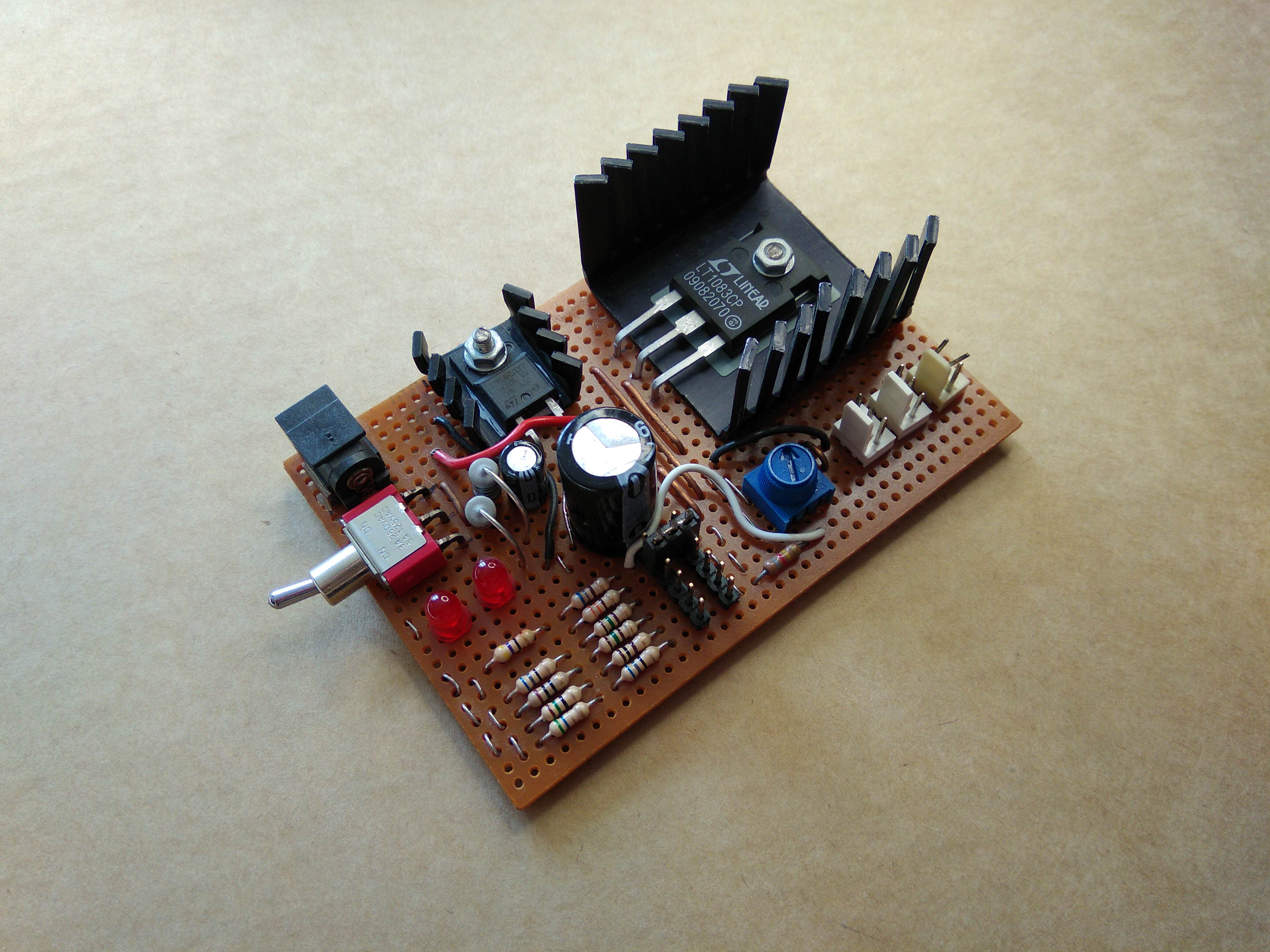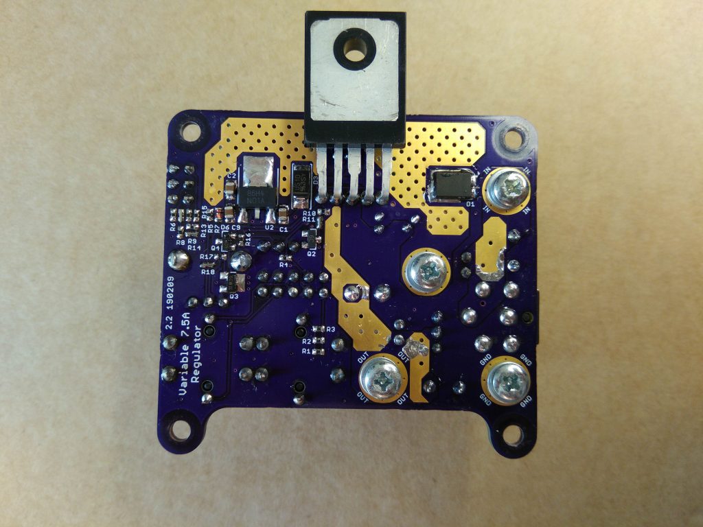 I often needed a second supply voltage so an auxiliary output was added using an LM317 regulator, with adjustable output voltage via a small trim potentiometer. The first PCB revision had the pads wired all wrong (based on an L78M), and upon powering up the board it quickly popped leaving a small hole in it.