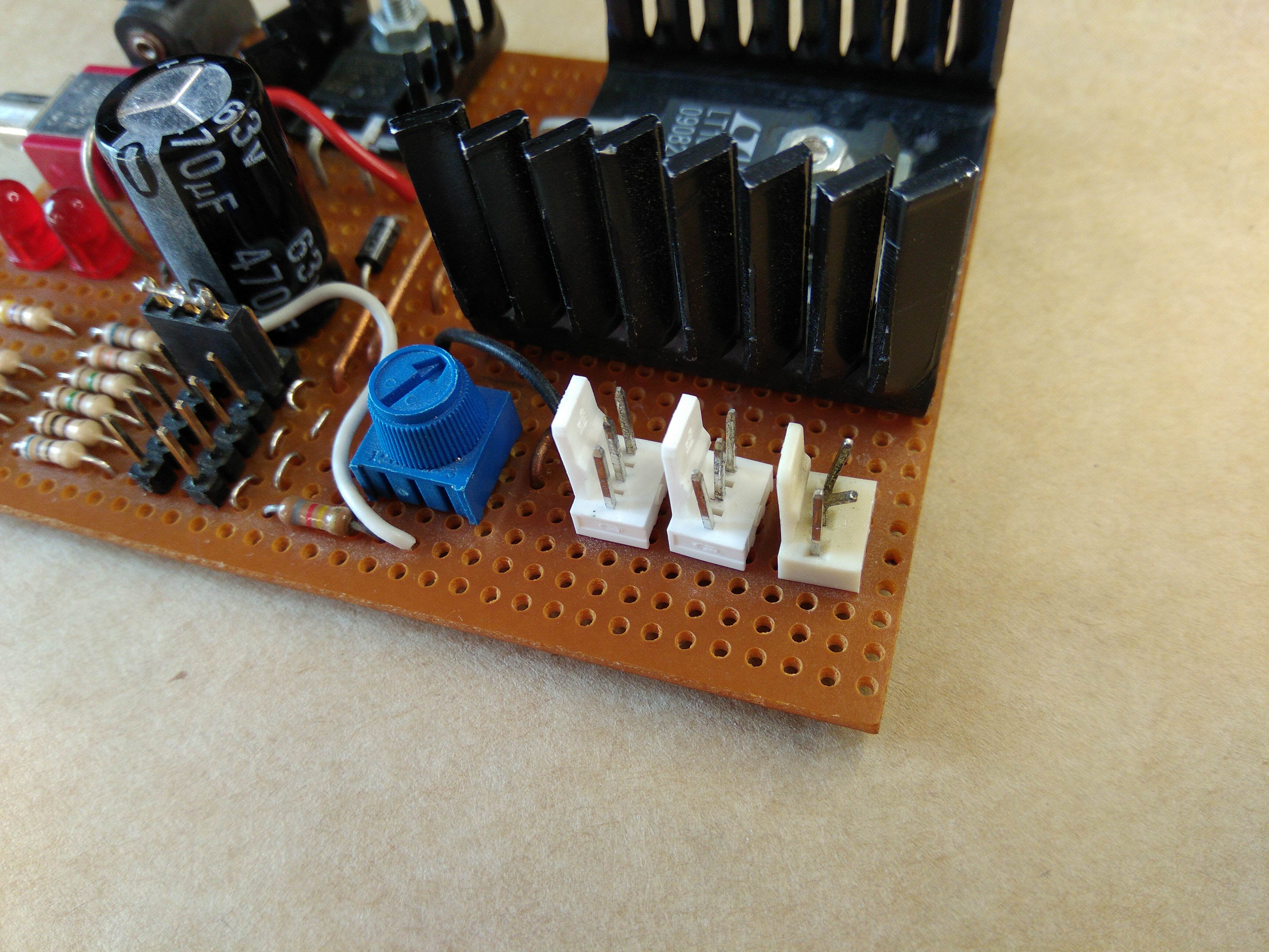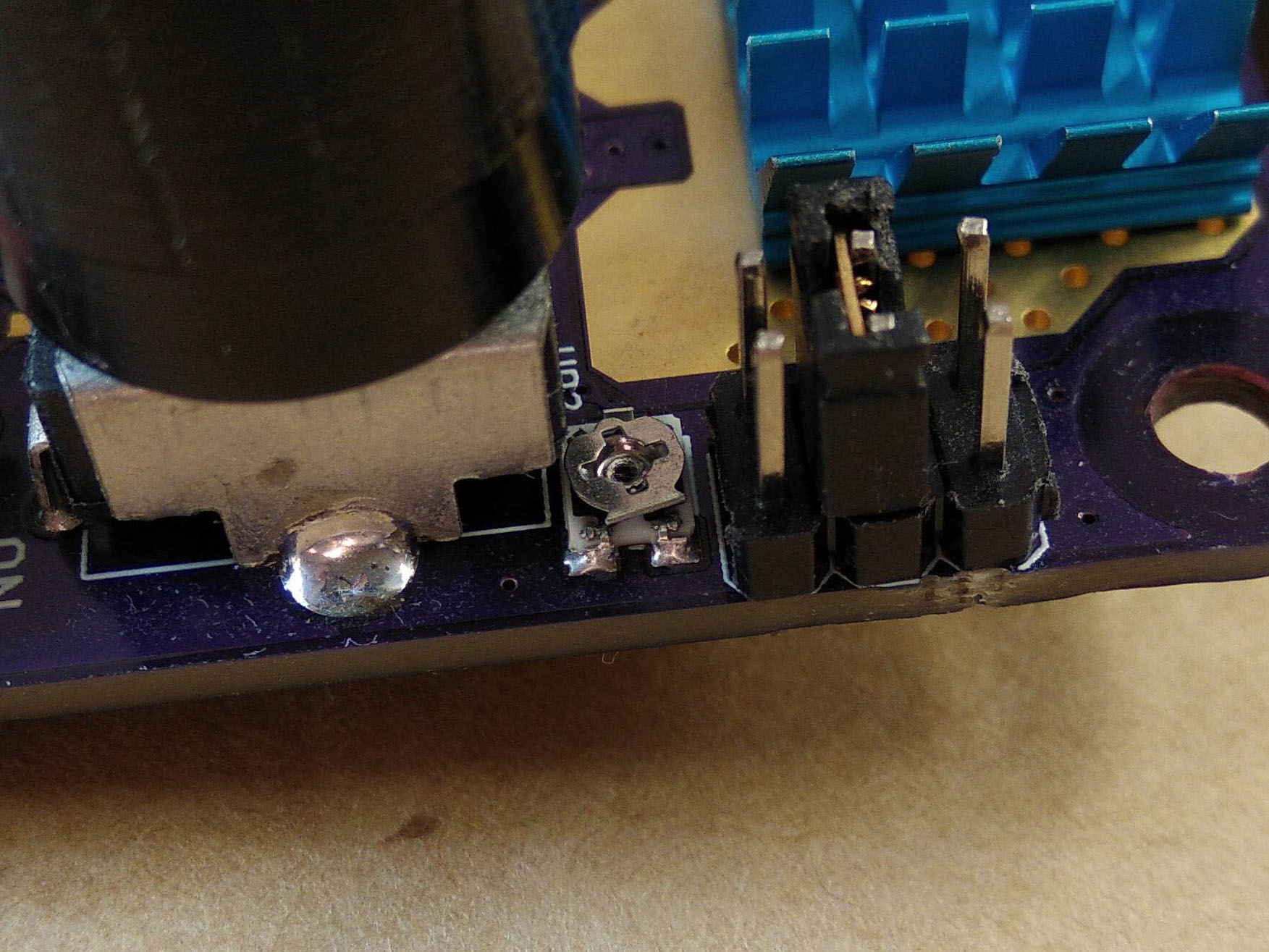 As for the new output power connectors, I’m quite fond of attaching crocodile clips to screws. Screw terminal blocks were also added as well as a few normal pin headers for lower current stuff. The connectors for input power are also similar; screws, terminal blocks and a 2.5mm DC jack for the laptop power supply. I completely forgot about banana plugs; I might have thought about added those too otherwise. There is also a 4th screw near the centre of the board, this is used for bypassing the input diode, if needed.