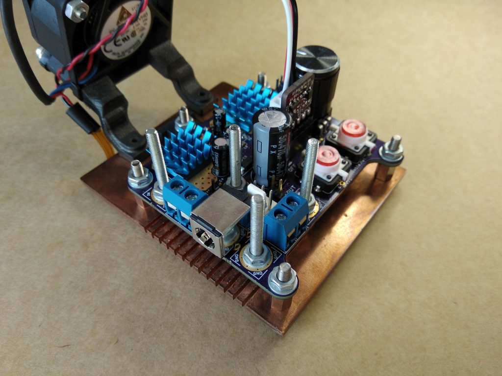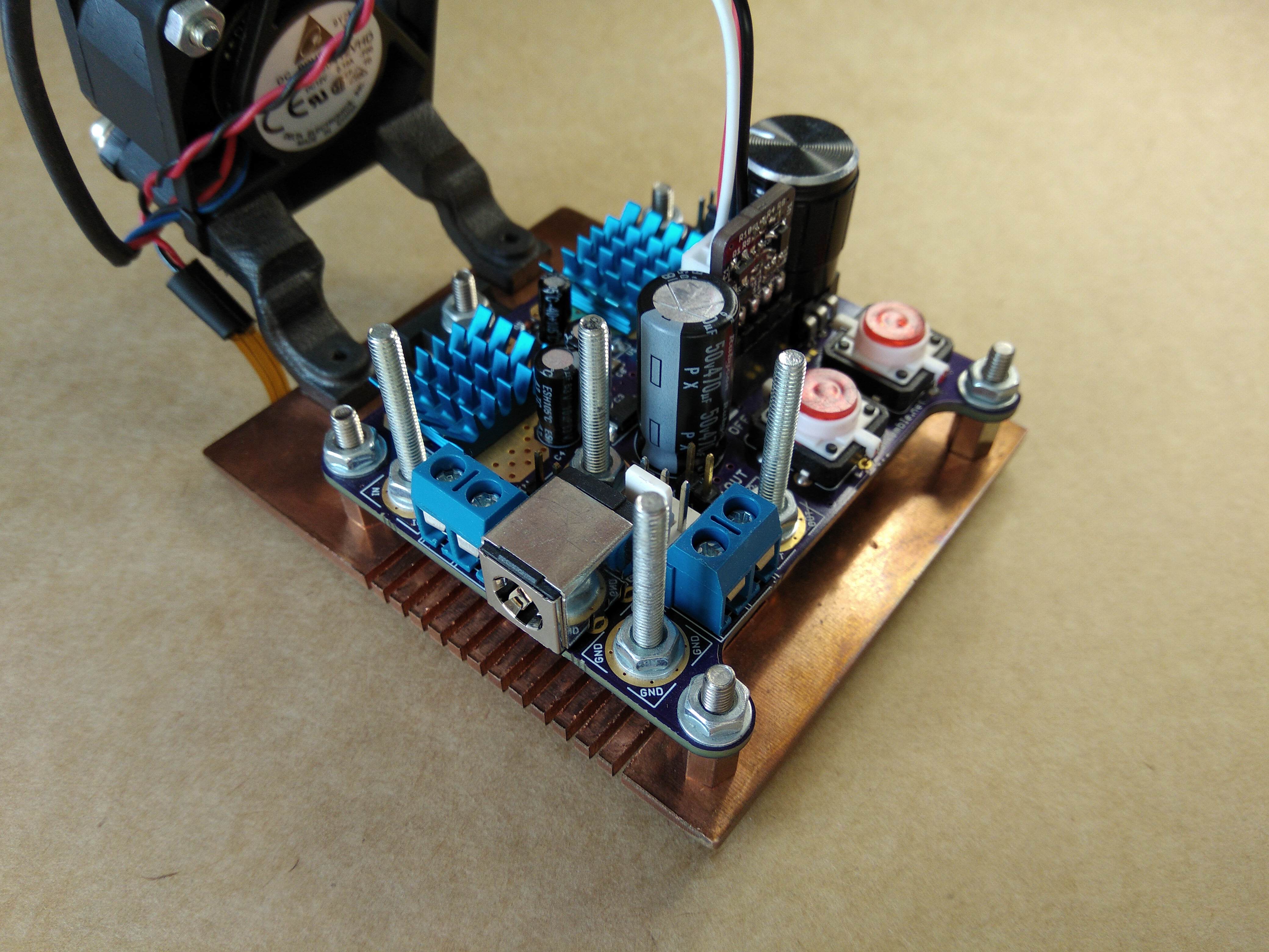 A small fan, actually a rather powerful Delta EFB0412VHD powered by the auxiliary output, was mounted at the back which improved things a lot. A small control board with an ATtiny10 was also made to control the fan based on the heatsink temperature, with a button for selecting auto/on/off.