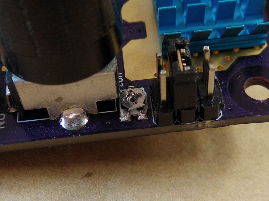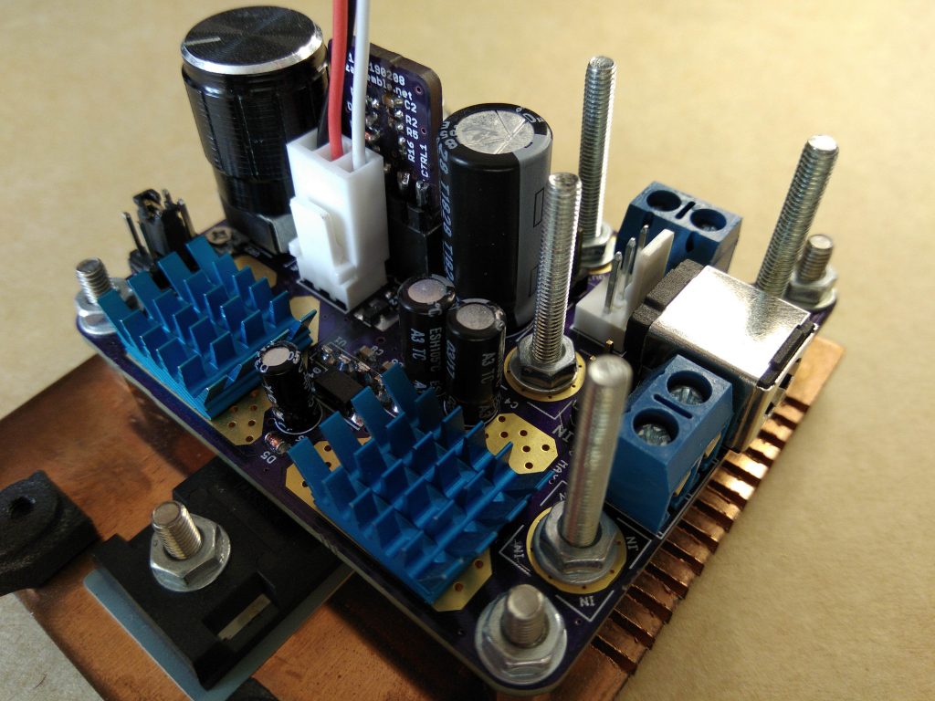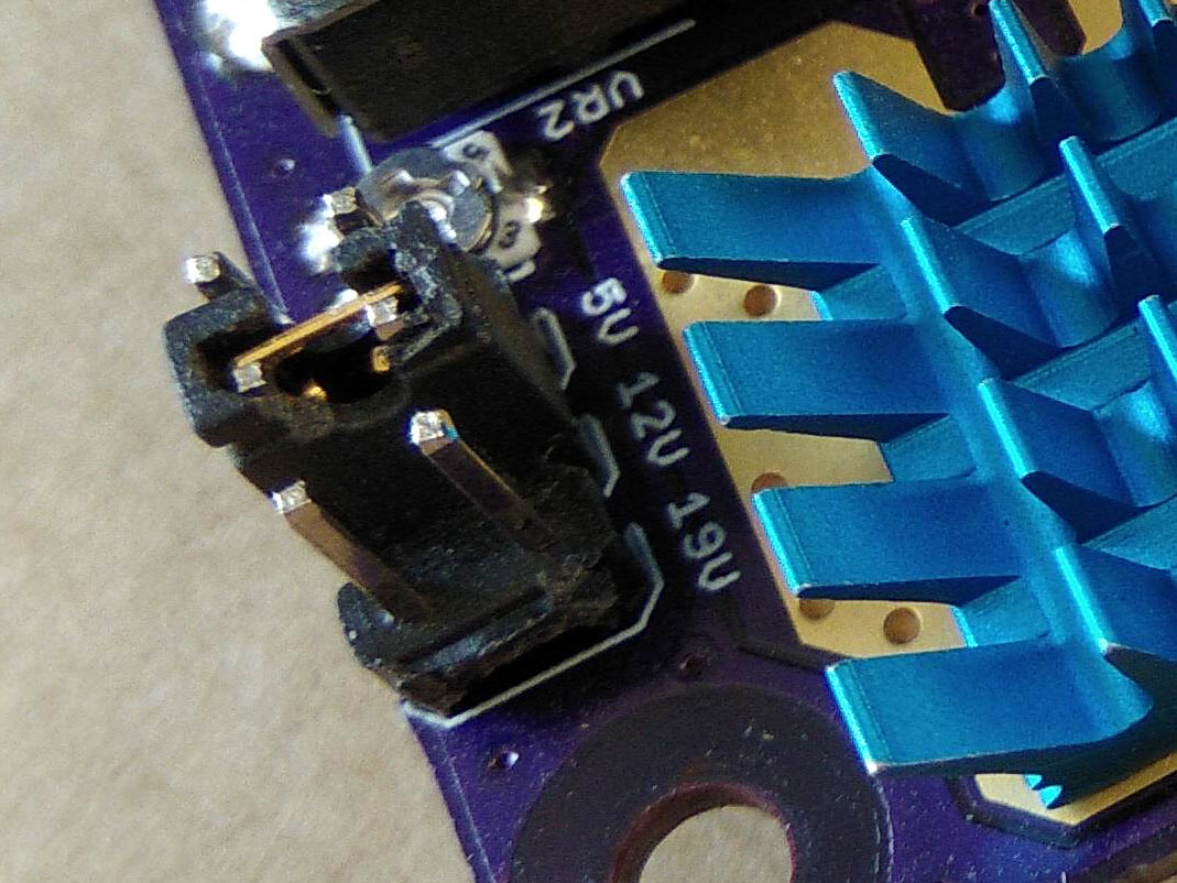 The testing of the heatsink performance was done by using a 3.3R 10W power resistor as a load with the output voltage set to 5V. The thermal limiter of the MIC29752 kicks in it at 125°C, where it begins to lower the output voltage, and thus current and heat dissipation, keeping the junction temperature from going any higher. After a few minutes the output voltage had dropped down to around 2.2V (0.66A through the resistor), and with an input of 19V this would mean the regulator could only dissipate 11.2W while keeping the junction temperature at 125°C. The junction-to-case thermal resistance of the regulator IC is 1.5°C/W, the thermal pad is 0.3C/W and room temperature was 25°C. So, the heatsink has a thermal resistance of (125 – (11.2 \* (1.5 + 0.3)) – 25) / 11.2 = 7.13°C/W. The original heatsink was rated at 7.2°C/W. Soooo it’s a bit of an improvement 😛
