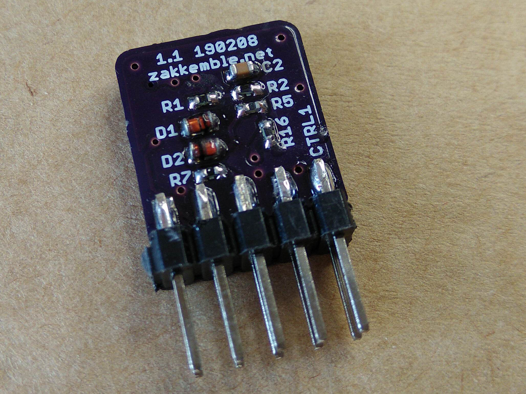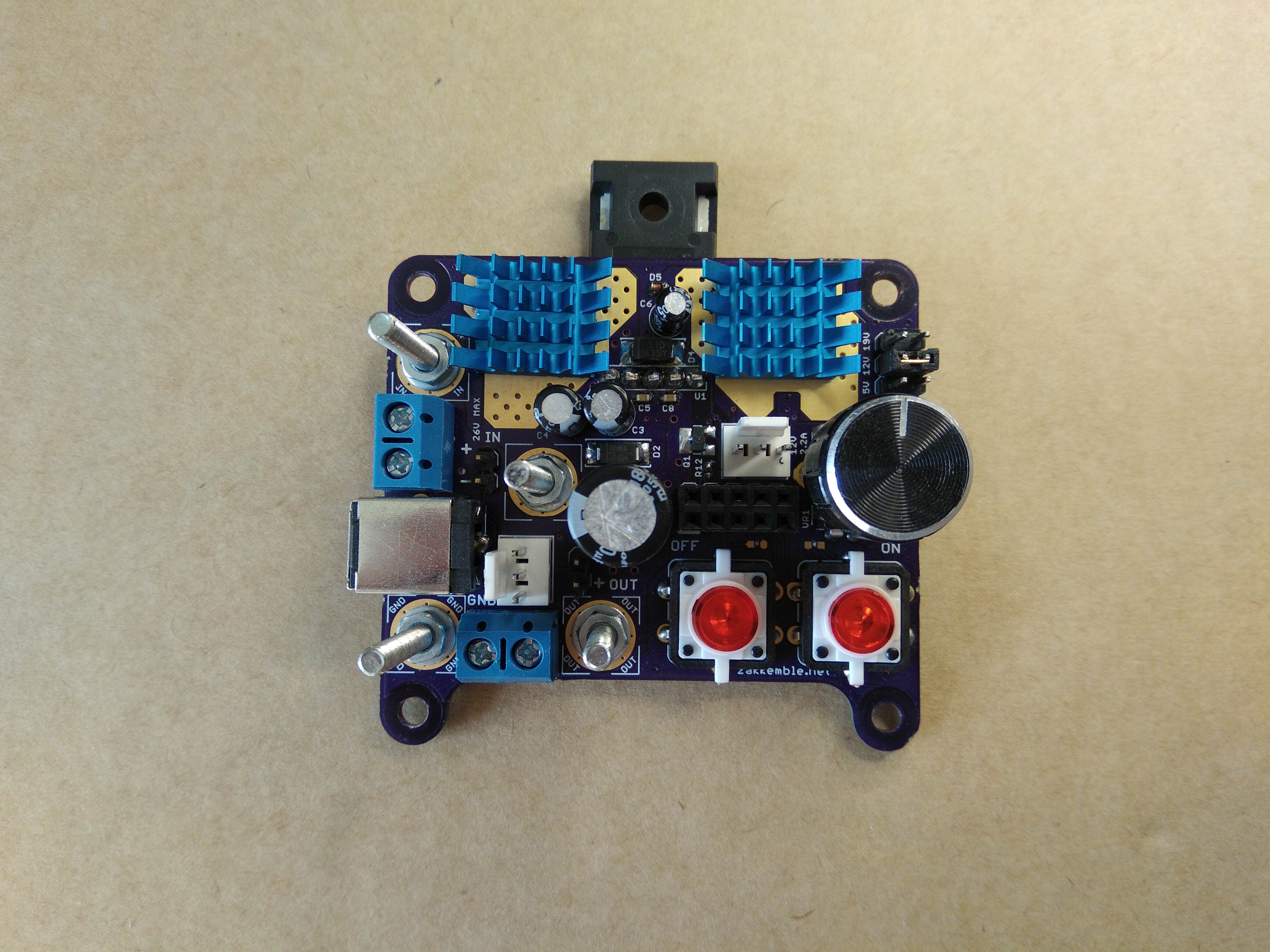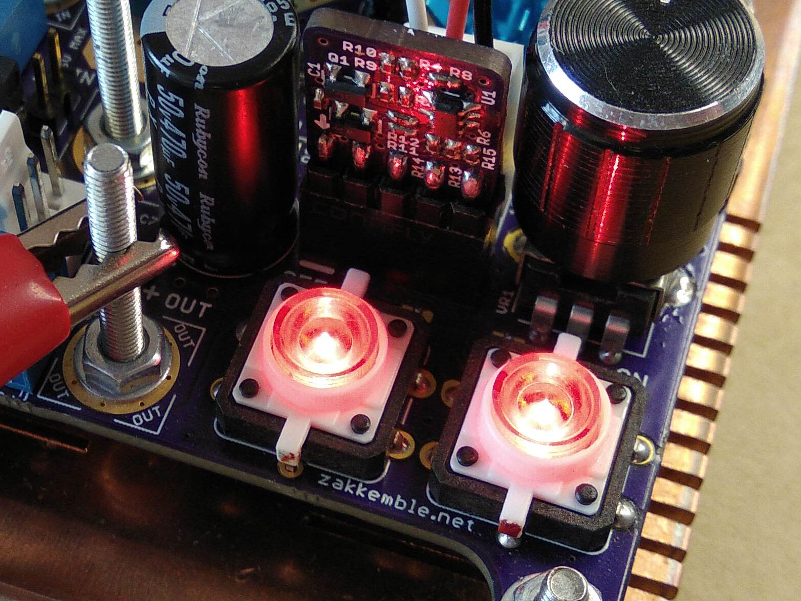 Power is now controlled via 2 push buttons with integrated LEDs, attached to a small, plug-in, all-analogue, control board for debouncing and controlling the enable pin of the main regulator IC. The control board can be swapped out, allowing for changing the behaviour of the buttons and LEDs or even external control of the power supply.