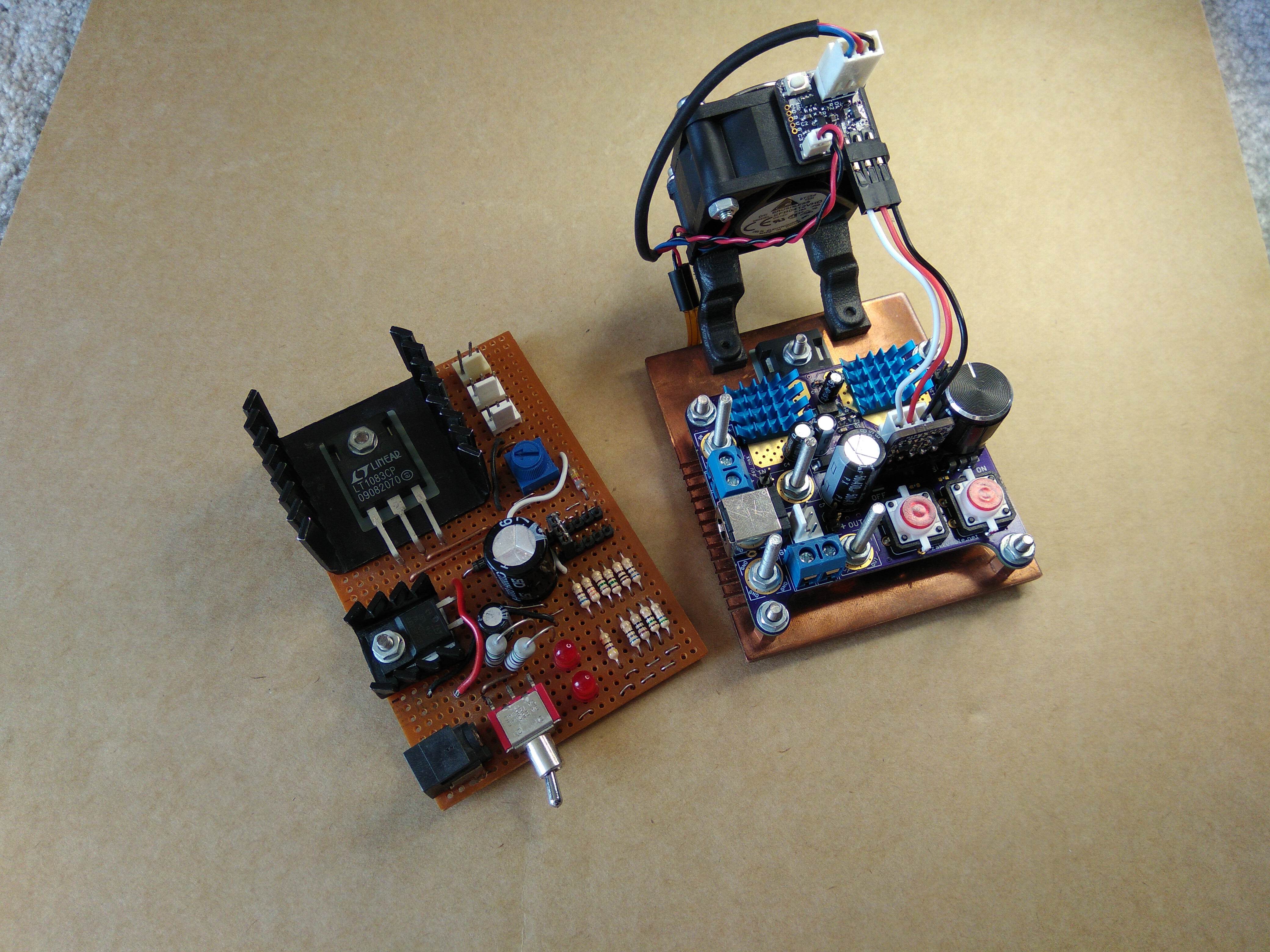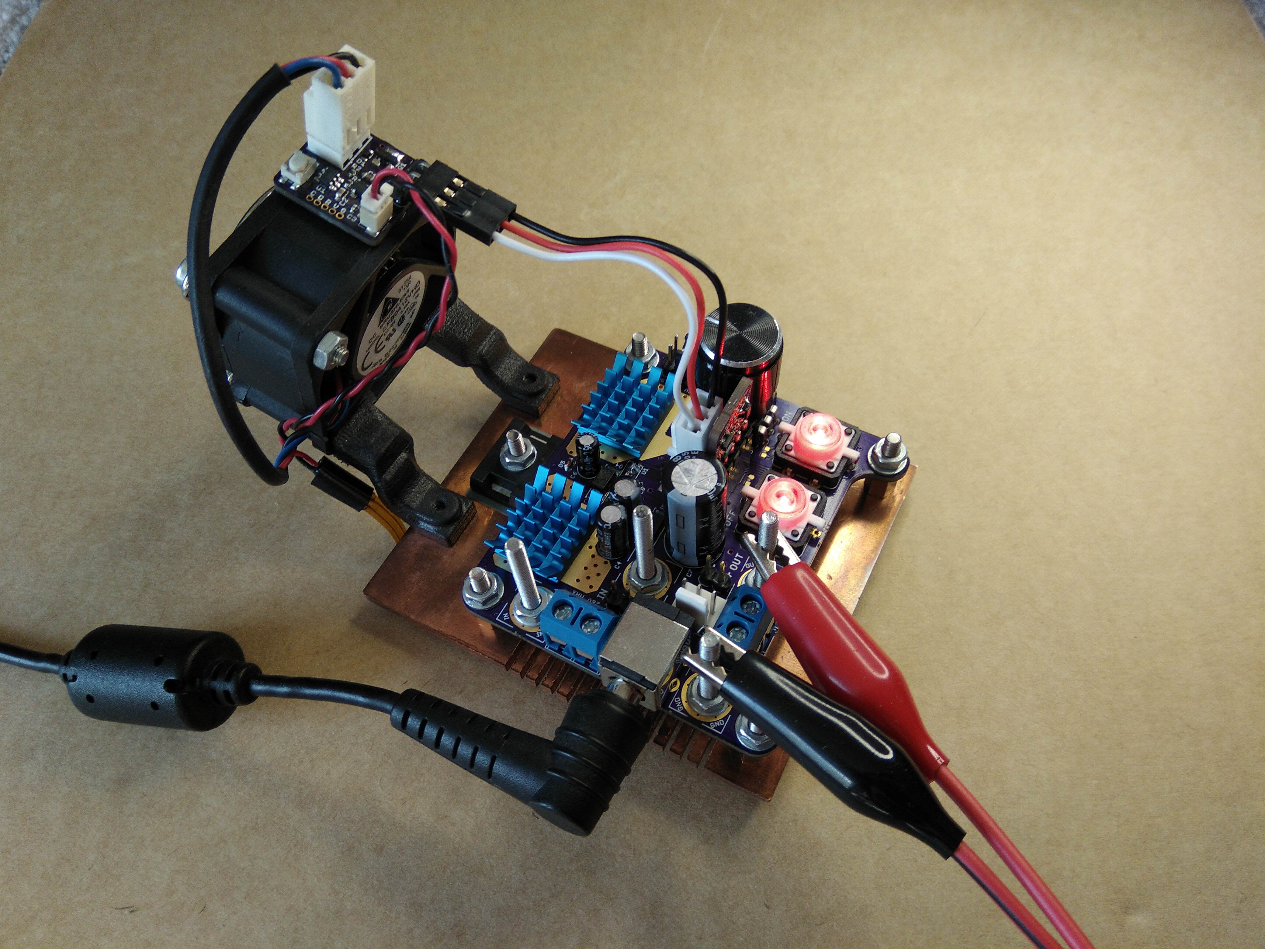 Overall, it’s a success! It’s much easier to use now that it has screws for attaching crocodile clips to, enough weight to stop it from sliding around the desk and has better cooling with the mounted fan. I’ll have to get around to making the current limiter and displays board sometime, but I think I’ll just buy a real bench power supply, hah!