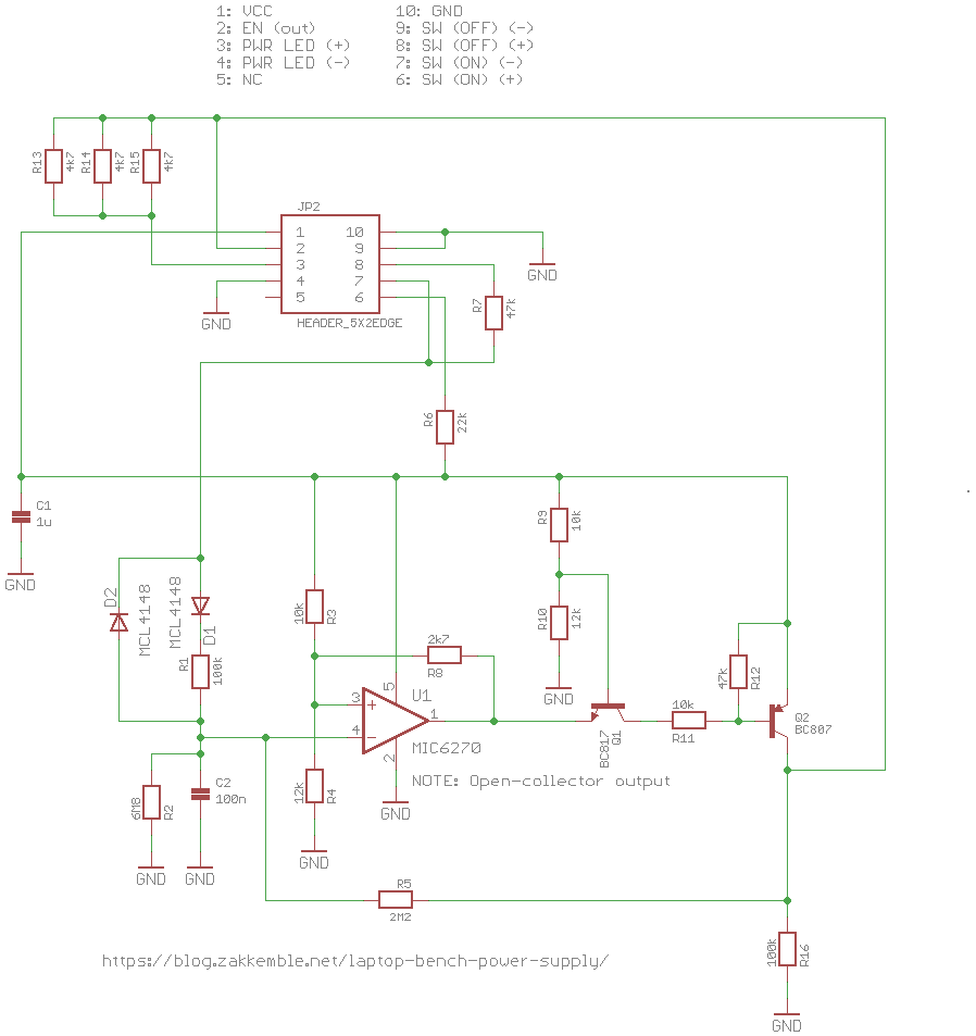 The control circuit has a few more components than most latching comparator circuits, as I wanted it to remember the on/off state for around 250ms after losing power (state is stored in C2) since the laptop PSU cycles on-off-on-off during overload and I didn’t want the regulator to reset back to off when this happened. It also needed to be able to handle debouncing when both buttons are pressed at the same time when creating the momentary-style ‘on’ button. Q2 inverts the comparator output and Q1 is needed otherwise Q2 will never turn off as current can pass through R8 and R4 to ground. Simulate the circuit on [Falstad Circuit Sim].