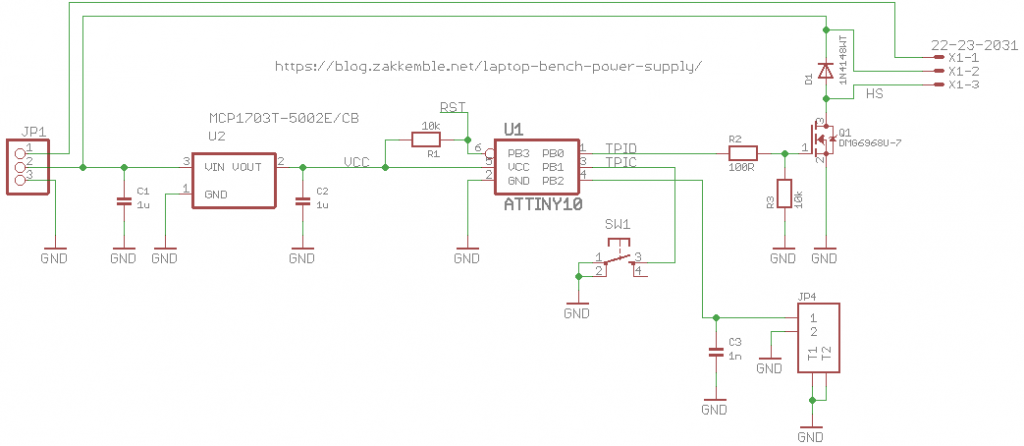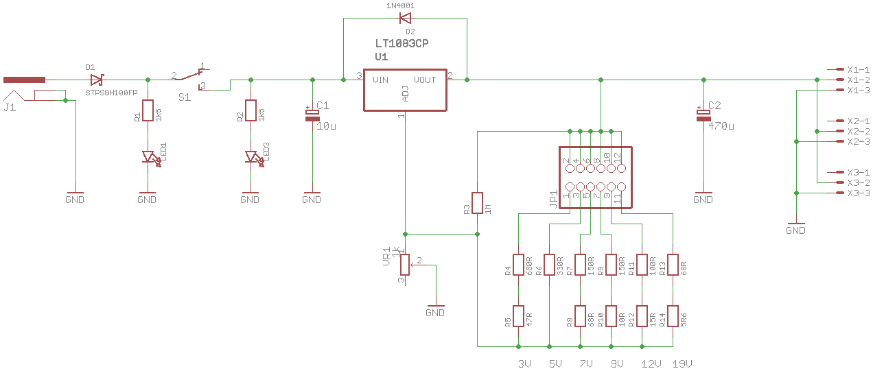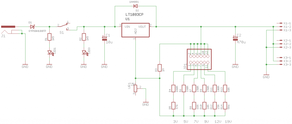 The old power supply also had a selector jumper for 6 voltage ranges; 3V, 5V, 7V, 9V, 12V and 19V. I think I’ve only ever used the 5V, 12V and 19V ranges, so that’s all the new power supply now has. Having a voltage range selector makes fine adjustments to the output voltage easier and also works as a bit of a fail-safe so you don’t accidently turn the voltage control knob all the way to 19V when attached to a 5V circuit!