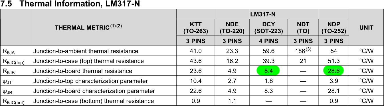 I also noticed that the SOT-223 package of the LM317 had a much lower junction-to-board thermal resistance and higher current limit than the larger SOT-252-3/DPAK package, which seemed unusual, so I brought both types and tried them on the board. I found that the SOT-223 could dissipate far more power than the larger SOT-252 package before it started to thermally limit itself. I thought it would have been the other way around? Not to worry, the SOT-223 package sits nicely into the SOT-252 footprint.