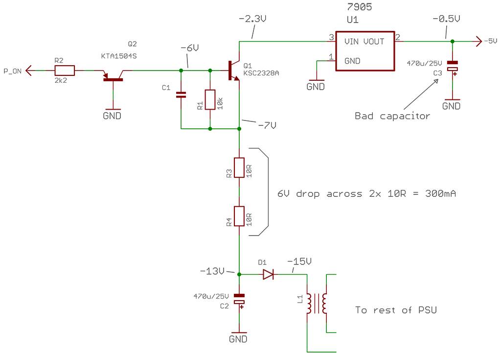 A bit of reversing engineering and probing around the power supply’s -5V rail resulted with this schematic and voltage readings: