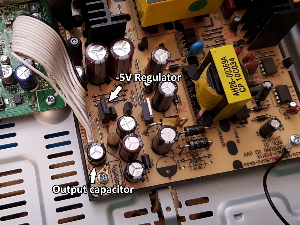 I opened it up and looked around for any blown components, like the usual bulging capacitors, but nothing looked out of the ordinary. I probed around the power supply and checked that the output voltages were correct, which were handily printed onto the PCBs, and found that the -5V rail was only outputting around -0.5V. That’s pretty sus.